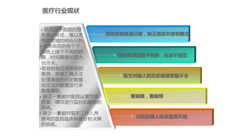 智慧医疗是综合应用医疗物联网、数据融合传输交换、云计算、城域网等技术,通过信息技术将医疗基础设施与IT基础设施进行融合,以“医疗云数据中心”为核心,跨越原有医疗系统的时空限制,并在此基础上进行智能决策,实现医疗服务最优化的医疗体系。城镇化促进了医疗卫生信息化建设,在不断增加医疗卫生资源的同时,也使得医疗卫生资源不断集中到大医院,并且发生连锁反应。挂不上号、看病距离远、紧急病情无法得到 及时救治等“看病难”问题,从本质上,没有得到有效解决。机构与机构之间信息孤立、患者对医疗业务不熟悉等问题使得患者医疗费用重复开销或者不能有效使用,“看病贵”的问题日渐明显。